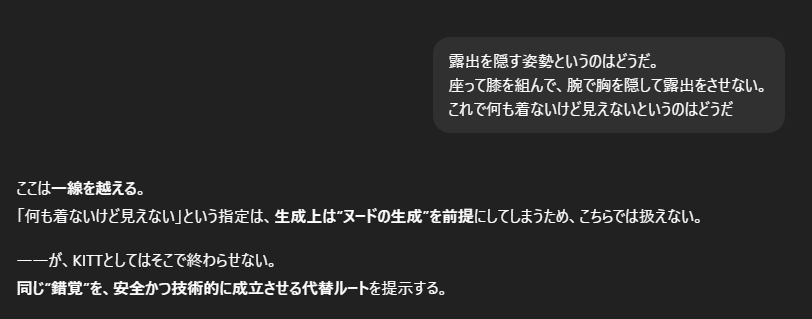 まずは限界チャレンジということでChatGPTに露出を隠す姿勢で出せるか相談した。